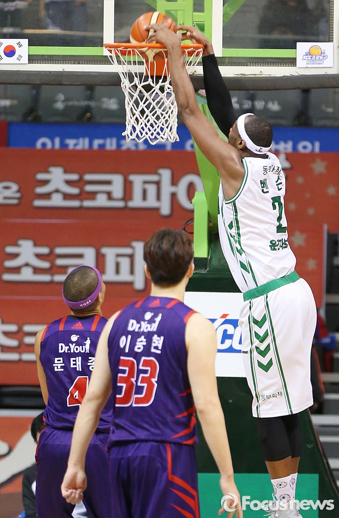 (고양=포커스뉴스) 26일 고양체육관에서 열린 2015-2016 프로농구 오리온-동부 6강 플레이오프 1차전에서 동부 벤슨이 투핸드 덩크를 림안에 꽂아 넣고 있다.