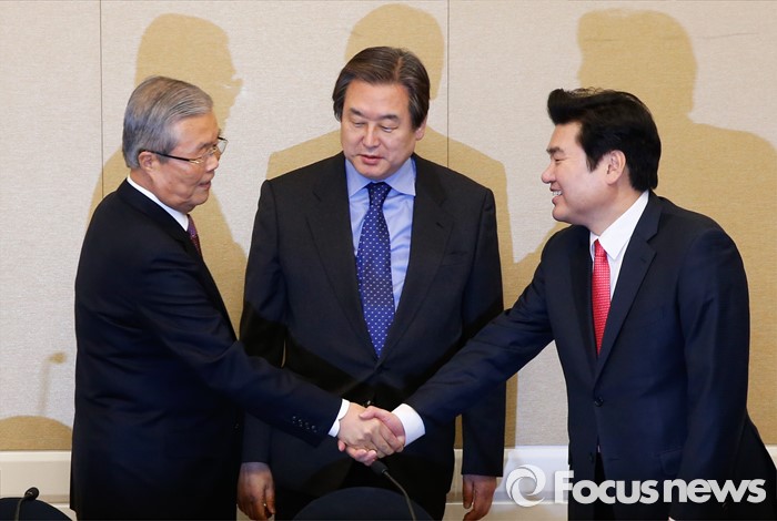 (서울=포커스뉴스) 테러방지법 직권상정에 반발해 야당이 무제한 토론(필리버스터)를 나흘째 진행하고 있는 26일 오후 서울 여의도 국회 귀빈식당에서 선거구 획정 및 쟁점법안 논의를 위해 열린 여야 지도부 회동에 참석한 원유철(오른쪽) 새누리당 원내대표와 김종인 더불어민주당 비대위 대표가 악수 하고 있다. 가운데는 김무성 새누리당 대표.