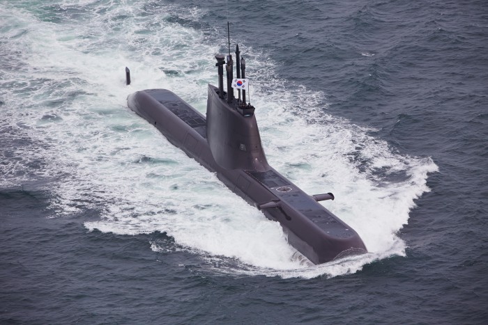 승조원 40명이 탑승할 수 있는 홍범도함은 길이 65.3m, 폭 6.3m, 최대속력 20노트(시속 37km)로 대함전 및 대잠수함전, 공격기뢰부설 임무 등을 수행할 수 있고, 적의 핵심시설에 대한 장거리 정밀 타격이 가능한 국산 순항미사일을 탑재한다.작전을 펼치고 있는 214급 잠수함. <사진제공=해군>