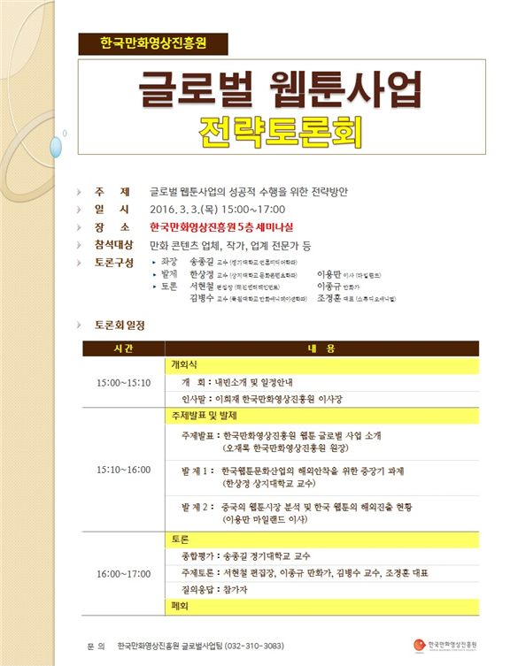 자세한 사항은 한국만화영상진흥원 홈페이지(www.komacon.kr)를 참조하거나 글로벌사업팀(032-310-3083)으로 문의하면 된다.'글로벌 웹툰사업 전략토론회' 포스터.<사진제공=한국만화영상진흥원>