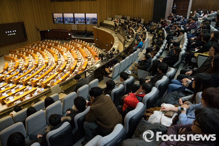 (서울=포커스뉴스) 테러방지법 직권상정에 반발해 야당의 무제한 토론(필리버스터)이 진행되고 있는 28일 오후 서울 여의도 국회 본회의 장에서 23번째 토론에 참여한 이학영 더불어민주당 의원이 발언하고 있는 가운데 시민 방청객들이 지켜보고 있다.