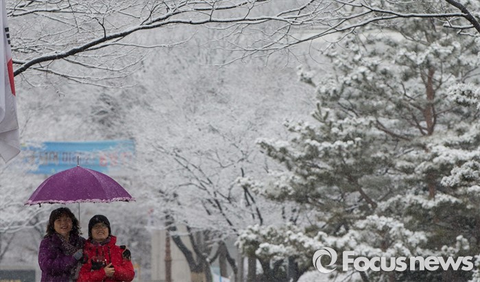 (서울=포커스뉴스) 수도권과 전국 곳곳에에 강한 바람과 함께 기습적인 폭설이 내린 28일 오후 서울 강북구 4.19 민주묘지에서 시민들이 산책을 즐기고 있다.