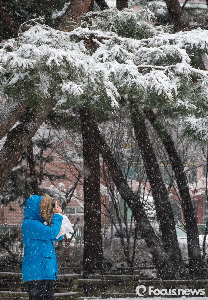(서울=포커스뉴스) 수도권과 전국 곳곳에에 강한 바람과 함께 기습적인 폭설이 내린 28일 오후 서울 강북구 솔밭공원에서 한 시민이 사진을 찍고 있다.