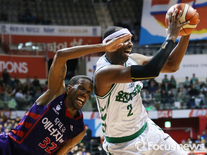 (고양=포커스뉴스) 28일 고양체육관에서 열린 2015-2016 프로농구 오리온-동부 6강 플레이오프 2차전에서 동부 벤슨이 오리온 헤인즈와의 리바운드 다툼에서 볼을 잡아내고 있다.