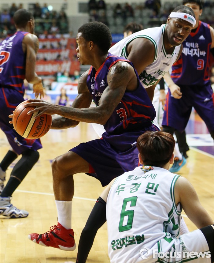 (고양=포커스뉴스) 28일 고양체육관에서 열린 2015-2016 프로농구 오리온-동부 6강 플레이오프 2차전에서 오리온 조 잭슨이 동부 벤슨과 두경민의 수비를 뚫으며 돌파를 시도하고 있다.