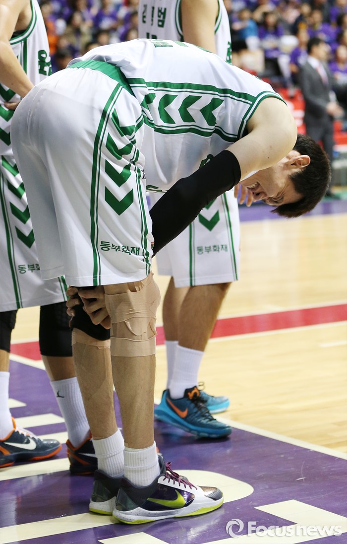 (고양=포커스뉴스) 28일 고양체육관에서 열린 2015-2016 프로농구 오리온-동부 6강 플레이오프 2차전에서 동부 김주성이 경기중 충돌로 넘어지며 왼쪽 무릎을 다친 후 고통스러워하고 있다.