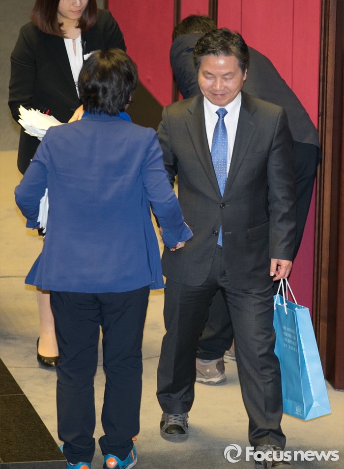 (서울=포커스뉴스) 테러방지법 직권상정에 반발해 야당이 무제한 토론(필리버스터)를 일주일째 진행하며 총 130시간을 돌파한 29일 오전 서울 여의도 국회 본회의장에서 토론을 마친 홍종학(오른쪽) 더불어민주당 의원과 다음 토론에 나선 서영교 의원이 악수하고 있다.