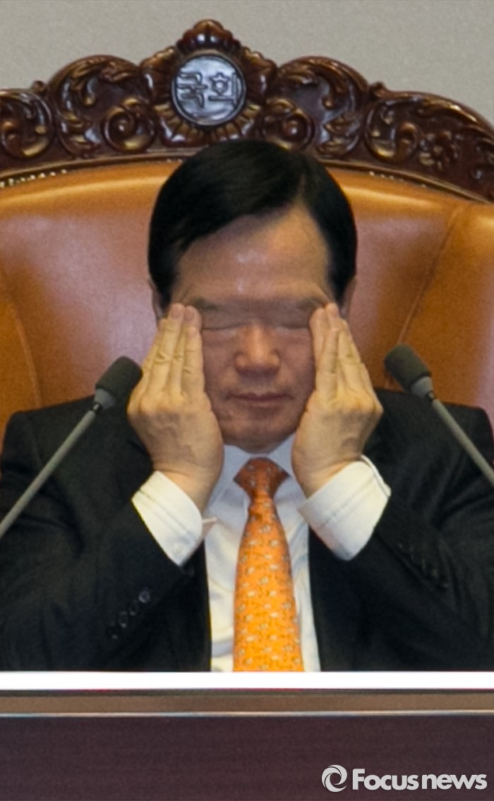 (서울=포커스뉴스) 테러방지법 직권상정에 반발해 야당이 무제한 토론(필리버스터)를 일주일째 진행하며 총 125시간을 돌파한 29일 오전 서울 여의도 국회 본회의장에서 정의화 국회의장이 피곤한 모습을 보이고 있다.