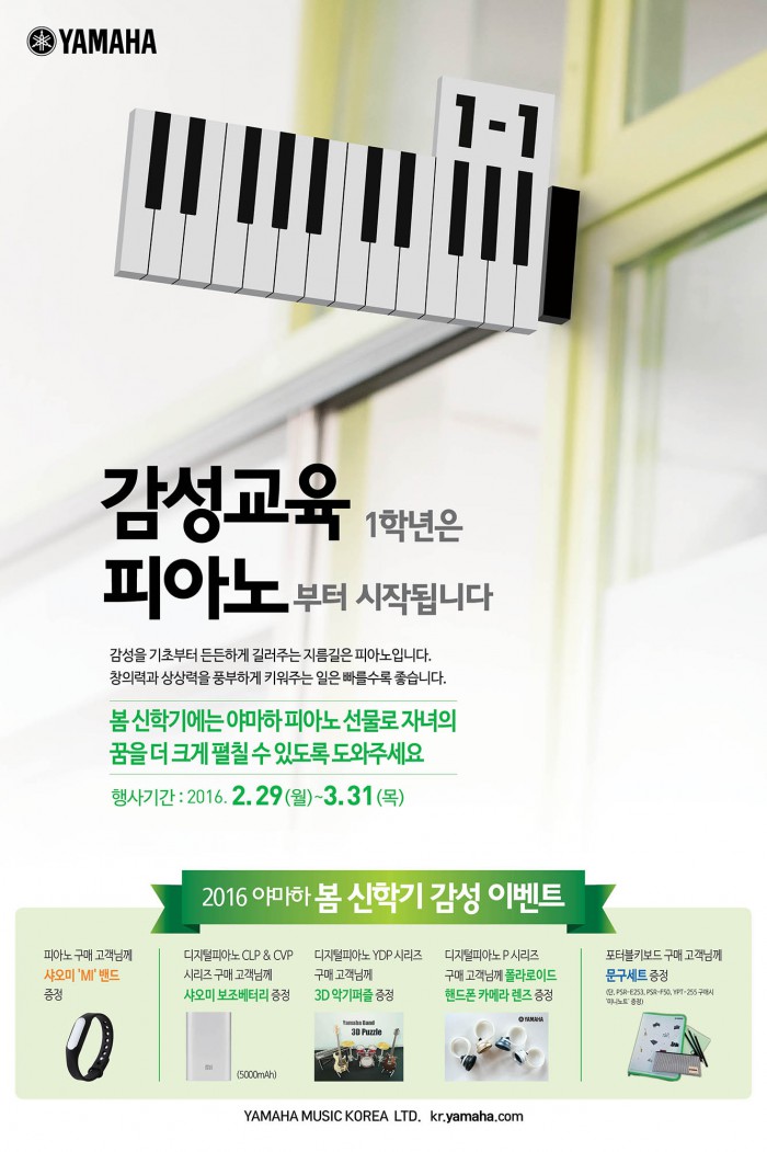 행사 기간 동안 피아노를 구매하면 'MI' 스마트밴드를, 디지털피아노 'CLP&CVP 시리즈'를 사면 보조배터리(5000mAh)를 준다. 또 야마하 디지털피아노 'YDP 시리즈'(YDP-141 제외) 구매자에겐 3D 악기퍼즐을, 디지털피아노 'P 시리즈' 구매자에겐 폴라로이드 핸드폰 카메라 렌즈를 증정한다.