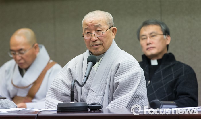 (서울=포커스뉴스) 29일 오후 서울 중구 프레스센터에서 '3.1 운동의 정신을 이어 민족의 평화와 화해, 신뢰회복을 위한 종교인 기자회견'에 참석한 불교 도법 스님이 인사말을 하고 있다.