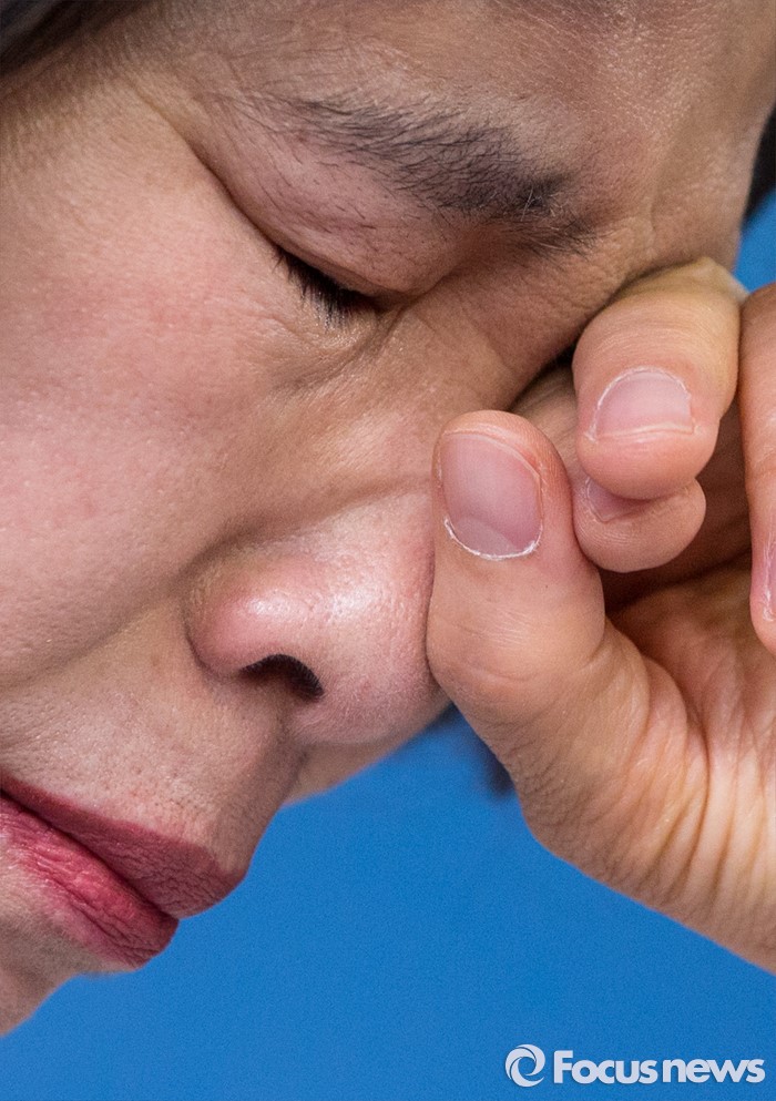 (서울=포커스뉴스) 더불어민주당의 '현역의원 평가 하위 20%'에 걸려 컷오프(공천배제)된 전정희 의원이 29일 오전 서울 여의도 국회 정론관에서 탈당 기자회견을 하며 눈물을 닦고 있다.