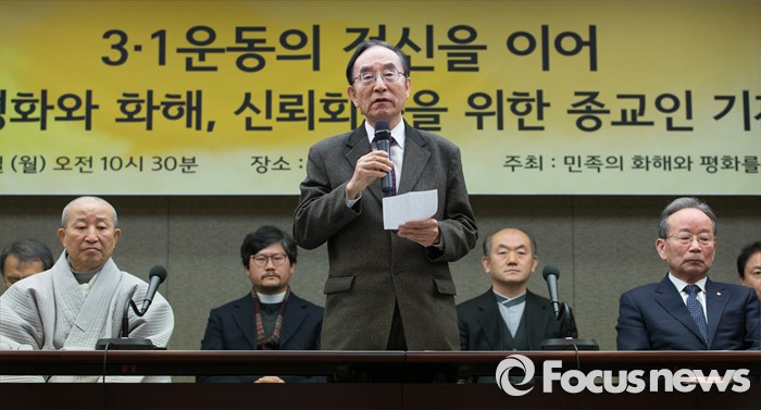 (서울=포커스뉴스) 29일 오후 서울 중구 프레스센터에서 '3.1 운동의 정신을 이어 민족의 평화와 화해, 신뢰회복을 위한 종교인 기자회견'에 참석한 김명혁 한국복음주의협의회 회장이 인사말을 하고 있다.