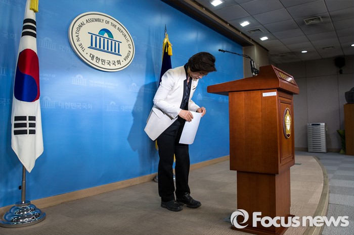 (서울=포커스뉴스) 더불어민주당의 '현역의원 평가 하위 20%'에 걸려 컷오프(공천배제)된 전정희 의원이 29일 오전 서울 여의도 국회 정론관에서 탈당 기자회견을 마친 뒤 인사하고 있다.