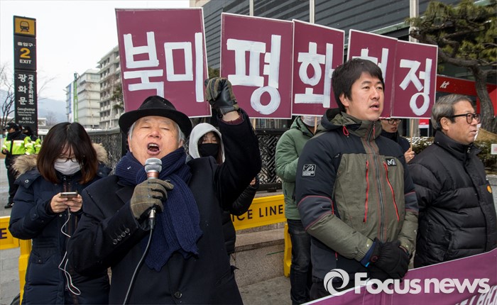 (서울=포커스뉴스) 29일 오후 서울 종로구 주한 미국대사관 옆에서 코리아연대 회원들이 '북미평화협정 체결 및 키리졸브훈련 반대'를 주장하는 구호를 외치고 있다.