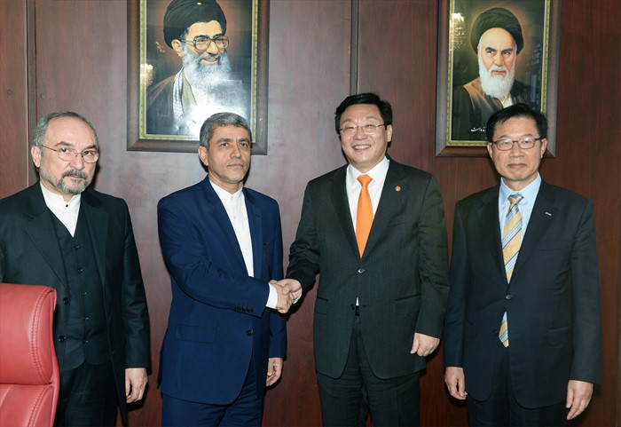(서울=포커스뉴스) 주형환 산업통상자원부 장관이 28일(현지시간) 이란 경제재정부를 방문해 알리 타옙니아(Ali Tayebnia) 이란 경제재정부 장관과 면담에 앞서 기념촬영을 하고 있다. 주 장관은 이날 면담에서 한-이란 양국간 경제 협력과 한국의 금융 및 개발원조 지원 확대, 보험과 자금세탁 관련 금융 협력 및 조세 협력에 관해 의견을 교환했다. <사진제공=산업통상자원부>