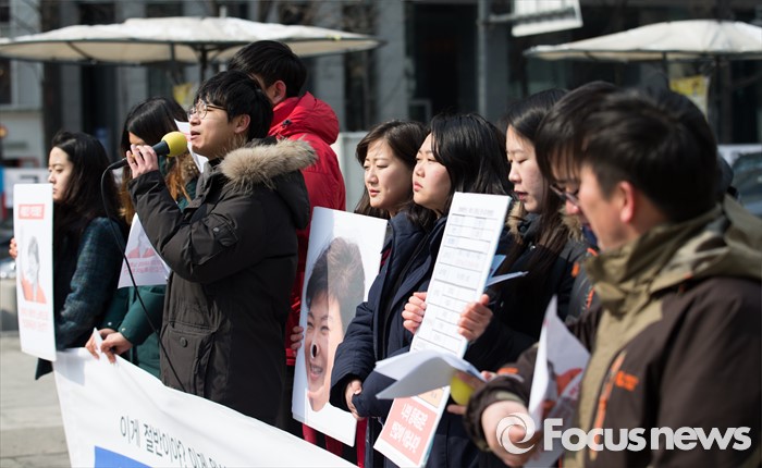 (서울=포커스뉴스) 29일 오후 서울 광화문광장에서 21세기 한국대학생연합 회원들이 정부의 반값등록금을 촉구하는 기자회견을 하고 있다.