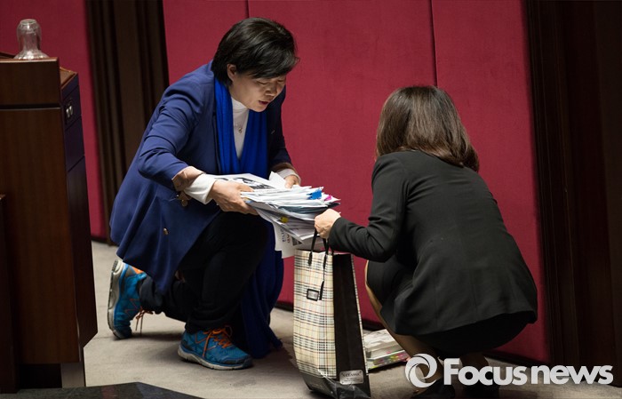 (서울=포커스뉴스) 테러방지법 직권상정에 반발해 야당이 무제한 토론(필리버스터)를 일주일째 진행하며 총 135시간을 돌파한 29일 오후, 서영교 더불어민주당 의원이 서울 여의도 국회 본회의장에서 토론을 마친 후 준비했던 자료를 정리하고 있다.