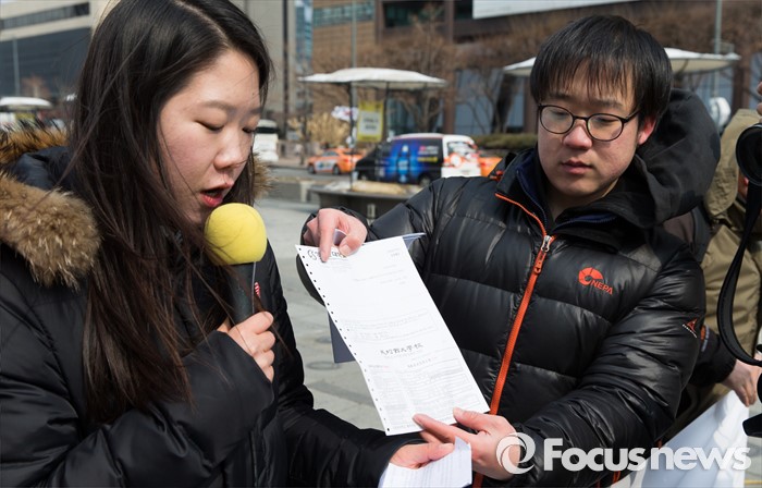 (서울=포커스뉴스) 29일 오후 서울 광화문광장에서 21세기 한국대학생연합 회원들이 정부의 반값등록금을 촉구하는 기자회견을 하고 있다.