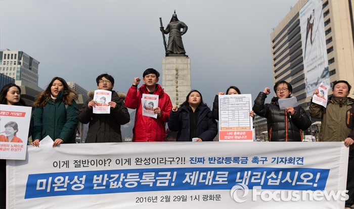 (서울=포커스뉴스) 29일 오후 서울 광화문광장에서 21세기 한국대학생연합 회원들이 정부의 반값등록금을 촉구하는 구호를 외치고 있다.