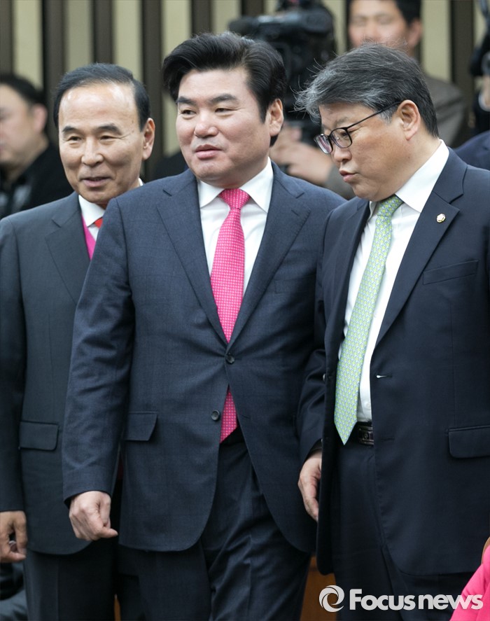 (서울=포커스뉴스) 원유철(가운데) 새누리당 원내대표와 조원진(오른쪽) 원내수석부대표가 29일 오후 서울 여의도 국회에서 열린 의원총회에 참석해 대화하고 있다.