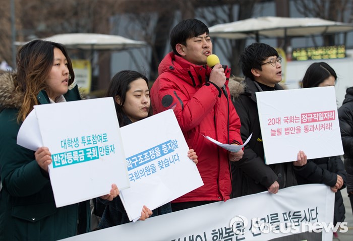 (서울=포커스뉴스) 29일 오후 서울 광화문광장에서 21세기 한국대학생연합 회원들이 '4.13총선 대학생참여 네트워크 무브(Move)' 발족 기자회견을 하고 있다.