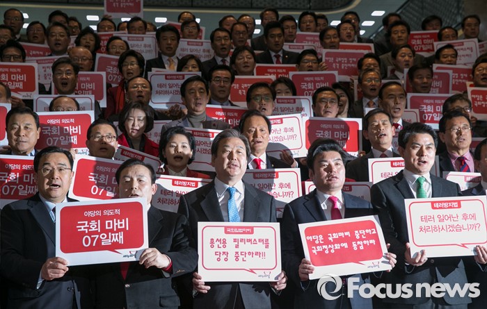 (서울=포커스뉴스) 김무성 새누리당 대표, 원유철 원내대표 등 의원들이 29일 오후 서울 여의도 국회에서 열린 의원총회를 마친 뒤 야당의 필리버스터(무제한 토론) 및 입법마비 규탄 결의대회를 하고 있다.