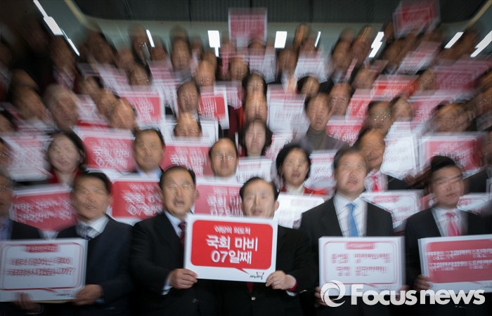 (서울=포커스뉴스) 김무성 새누리당 대표, 원유철 원내대표 등 의원들이 29일 오후 서울 여의도 국회에서 열린 의원총회를 마친 뒤 야당의 필리버스터(무제한 토론) 및 입법마비 규탄 결의대회를 하고 있다.