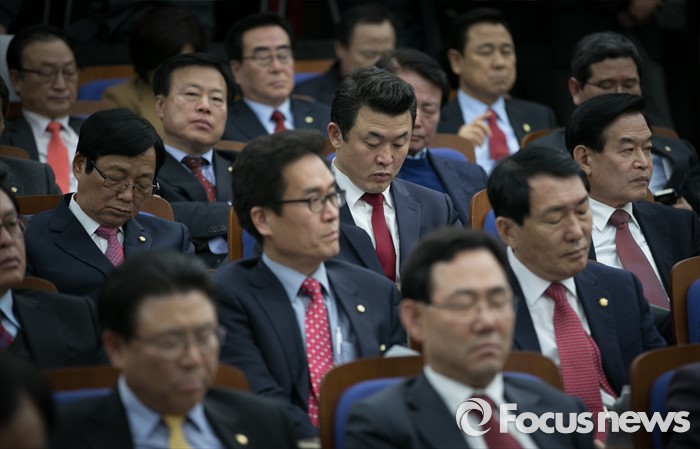 (서울=포커스뉴스) 붉은색 계열의 넥타이를 착용한 새누리당 의원들이 29일 오후 서울 여의도 국회에서 열린 의원총회에 참석해 원유철 원내대표의 발언을 듣고 있다.