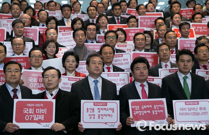 (서울=포커스뉴스) 김무성 새누리당 대표, 원유철 원내대표 등 의원들이 29일 오후 서울 여의도 국회에서 열린 의원총회를 마친 뒤 야당의 필리버스터(무제한 토론) 및 입법마비 규탄 결의대회를 하고 있다.