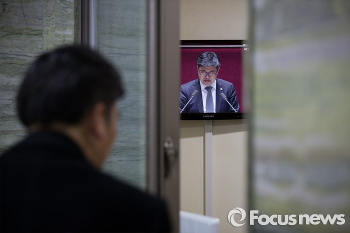 (서울=포커스뉴스) 테러방지법 직권상정에 반발해 야당이 무제한 토론(필리버스터)를 일주일째 진행하며 총 135시간을 돌파한 29일 오후, 서울 여의도 국회 본회의장에서 토론에 참여한 최원식 국민의당 의원의 발언하는 모습이 회의장 입구 앞 모니터로 보이고 있다.
