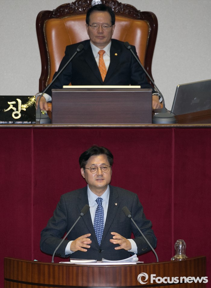 (서울=포커스뉴스) 테러방지법 직권상정에 반발해 야당이 무제한 토론(필리버스터)를 일주일째 진행하며 약 140시간을 돌파한 29일 오후 서울 여의도 국회 본회의장에서 토론에 참여한 홍익표 더불어민주당 의원이 발언하고 있다.
