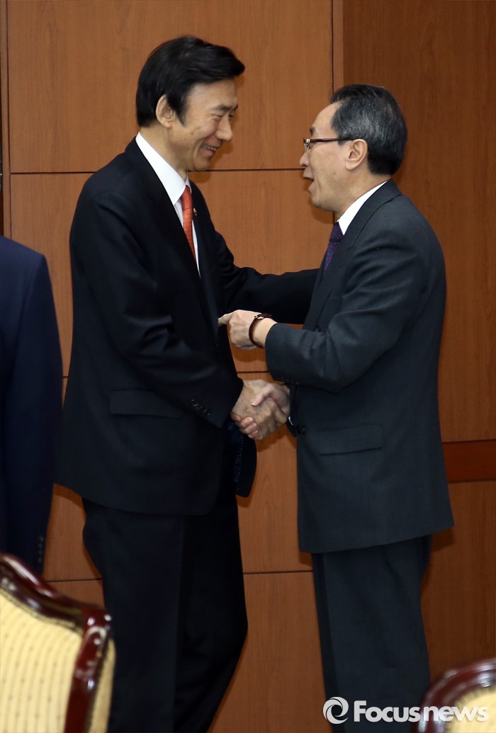 (서울=포커스뉴스) 29일 오후 서울 종로구 세종로 외교부청사에서 윤병세 외교부 장관과 우다웨이 북핵6자회담 중국 측 수석대표가 인사를 하고 있다.