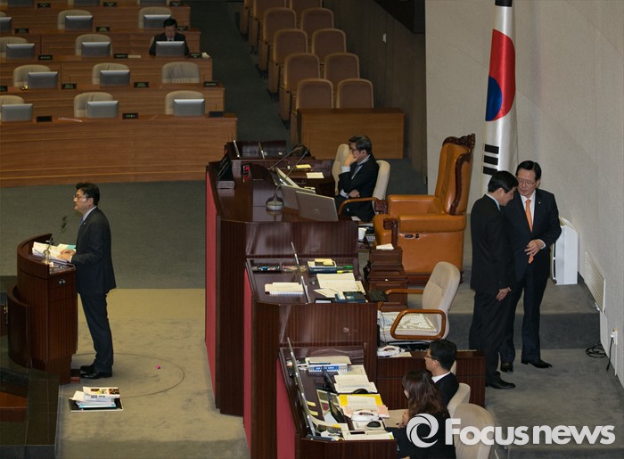 (서울=포커스뉴스) 테러방지법 직권상정에 반발해 야당이 무제한 토론(필리버스터)를 일주일째 진행하며 약 140시간을 돌파한 29일 오후 서울 여의도 국회 본회의장에서 정의화(오른쪽) 국회의장과 이종걸 더불어민주당 원내대표가 만나 대화하고 있다.