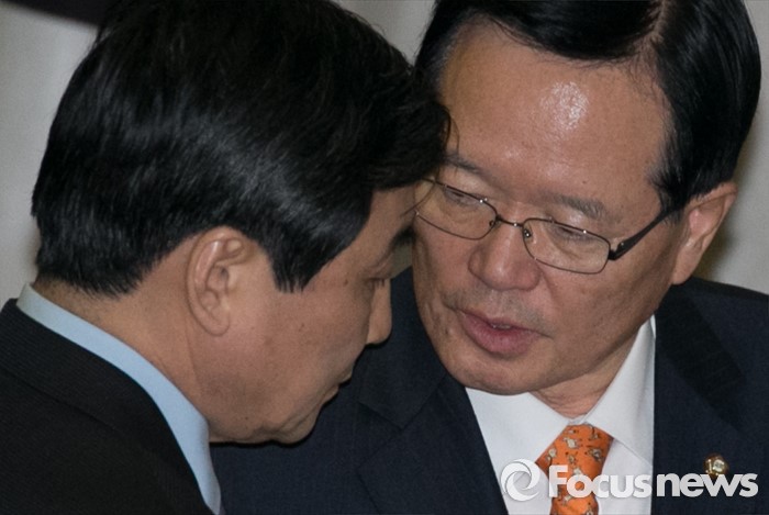 (서울=포커스뉴스) 테러방지법 직권상정에 반발해 야당이 무제한 토론(필리버스터)를 일주일째 진행하며 약 140시간을 돌파한 29일 오후 서울 여의도 국회 본회의장에서 정의화(오른쪽) 국회의장과 이종걸 더불어민주당 원내대표가 만나 대화하고 있다.