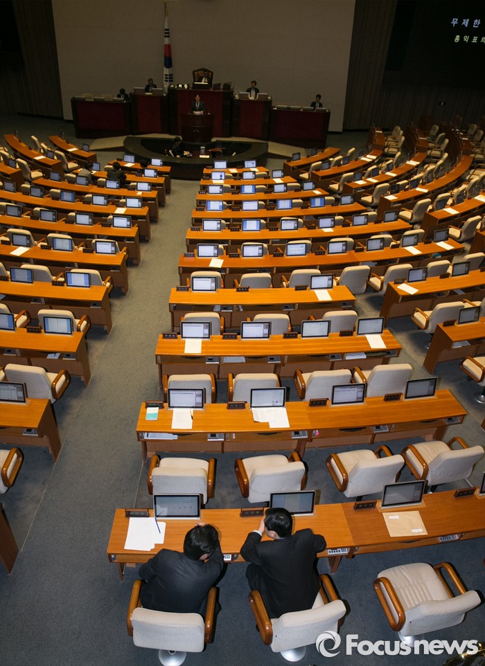 (서울=포커스뉴스) 테러방지법 직권상정에 반발해 야당이 무제한 토론(필리버스터)를 일주일째 진행하며 약 140시간을 돌파한 29일 오후 서울 여의도 국회 본회의장에서 원유철(왼쪽) 새누리당 원내대표와 이종걸 더불어민주당 원내대표가 대화하고 있다.