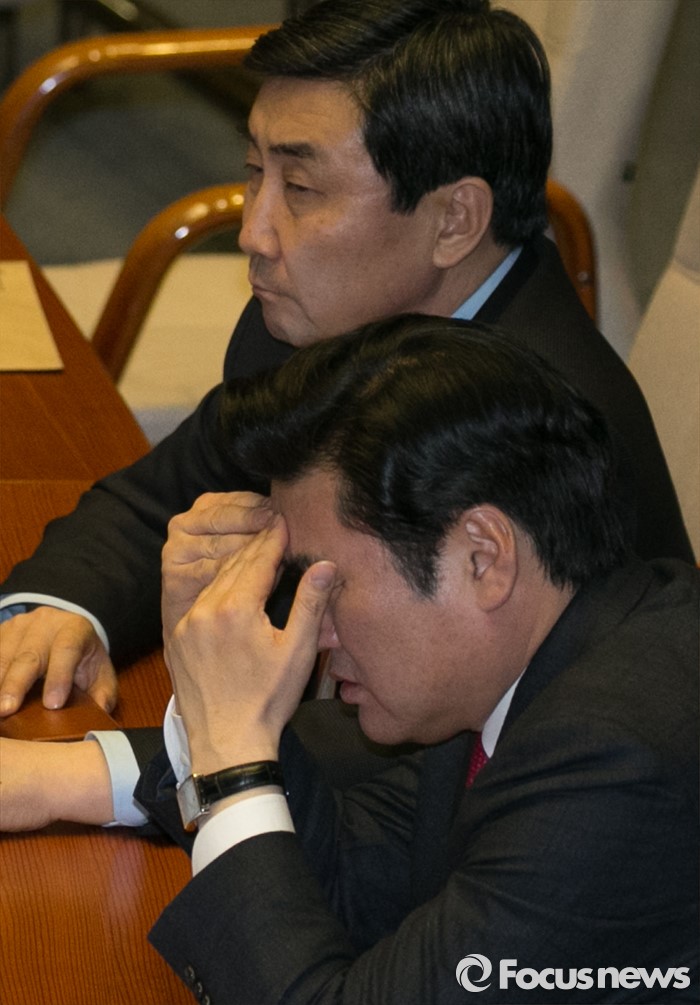 (서울=포커스뉴스) 테러방지법 직권상정에 반발해 야당이 무제한 토론(필리버스터)를 일주일째 진행하며 약 140시간을 돌파한 29일 오후 서울 여의도 국회 본회의장에서 원유철(아래) 새누리당 원내대표와 이종걸 더불어민주당 원내대표가 대화하고 있다.