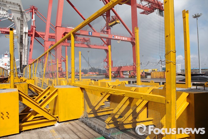 (서울=포커스포토) 세월호 주변을 둘러싸는 사각펜스 등 자재를 실은 상하이샐비지 소속 선박(센첸하오, Shen qian Hao)*이 지난 26일 낮 중국 상하이를 출발해 29일 오전 10시 30분경 목포신항으로 들어 왔다. 해수부는 이번에 설치할 철제 사각펜스는 앞으로 선수들기 및 인양시 유실방지망을 설치할 수 없는 선체 좌현쪽 개구부 등을 통한 유실을 방지하기 위하여 가로 200m×세로 160m×높이 3m 규모로 눈금 2.0㎝ 직사각형 모양의 철재망 36개 세트로서 25일간 설치할 예정이라고 밝혔다. <사진제공=해양수산부>