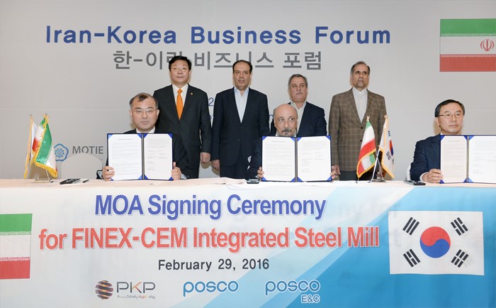 (서울=포커스뉴스) 주형환 산업통상자원부 장관은 29일(현지시간) 이란 테헤란 아자디호텔 자린홀에서 열린 '한-이란 비즈니스 포럼'에 참석하여, 포스코, 포스코건설, PKP사의 3자간 “160만톤 열연코일 제조를 위한 FINEX-CEM 제철소 건설”에 관한 '차바하 제철소 건설 관련 MOA 체결식'에 임석하고 있다.