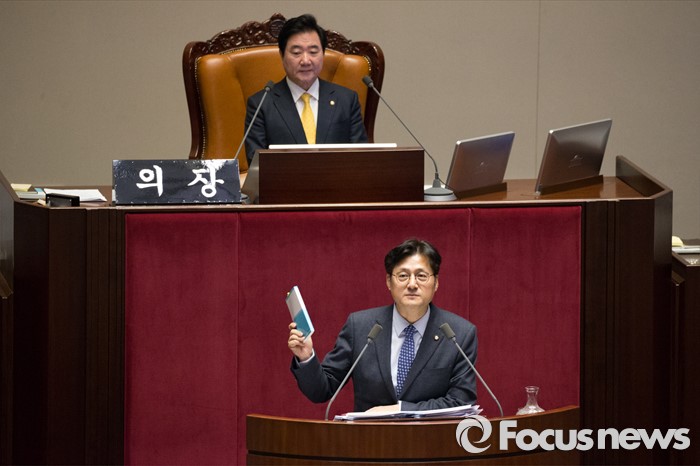 (서울=포커스뉴스) 테러방지법 직권상정에 반발해 야당이 무제한 토론(필리버스터)를 일주일째인 29일 오후 서울 여의도 국회 본회의장에서 토론에 참여한 홍익표 더불어민주당 의원이 발언하고 있다.