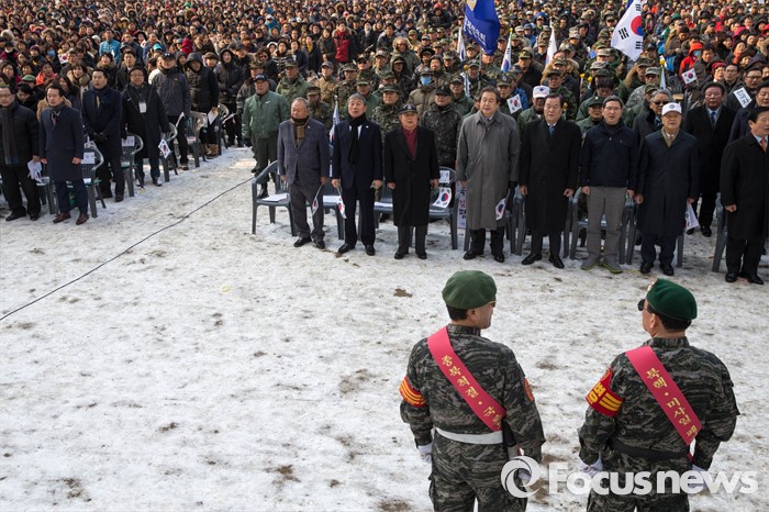 (서울=포커스뉴스) 김무성(앞줄 오른쪽 다섯번째) 새누리당 대표가 1일 오후 서울 시청 앞 광장에서 열린 '북핵폐기 삼일절 국민대회 및 구국기도회'에 참석, 애국가를 부르고 있다.