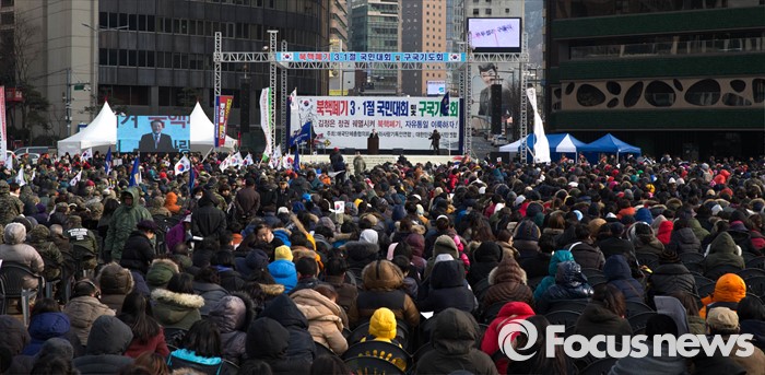 (서울=포커스뉴스) 1일 오후 서울 시청 앞 광장에서 애국단체총연맹이 주관하는 '북핵폐기 삼일절 국민대회 및 구국기도회'가 열리고 있다.