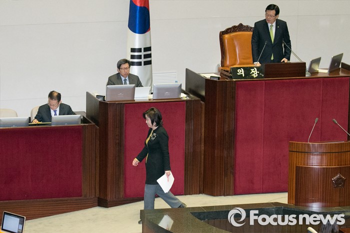 (서울=포커스뉴스) 심상정 정의당 대표가 2일 오전 서울 여의도 국회 본회의장에서 테러방지법 저지를 위한 무제한 토론(필리버스터)을 마친 뒤, 단상을 내려오고 있다.