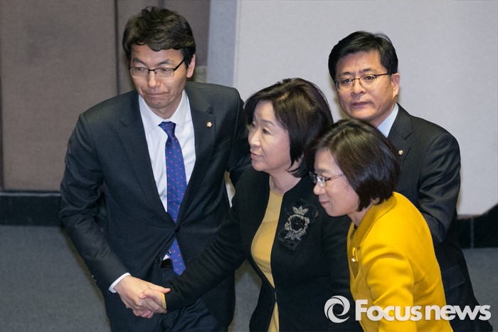 (서울=포커스뉴스) 심상정(앞줄 가운데) 정의당 대표가 2일 오전 서울 여의도 국회 본회의장에서 테러방지법 저지를 위한 무제한 토론(필리버스터)을 마친 뒤, 동료 의원들의 격려를 받고 있다.