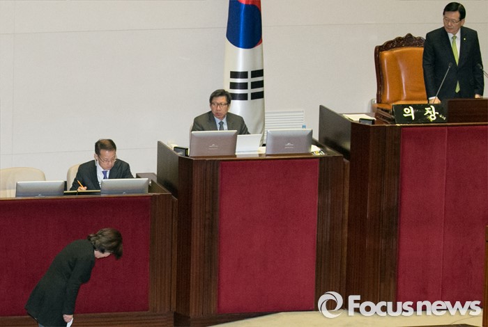 (서울=포커스뉴스) 심상정(앞줄 왼쪽) 정의당 대표가 2일 오전 서울 여의도 국회 본회의장에서 테러방지법 저지를 위한 무제한 토론(필리버스터)을 마친 뒤, 정의화(오른쪽) 의장에게 인사하고 있다.