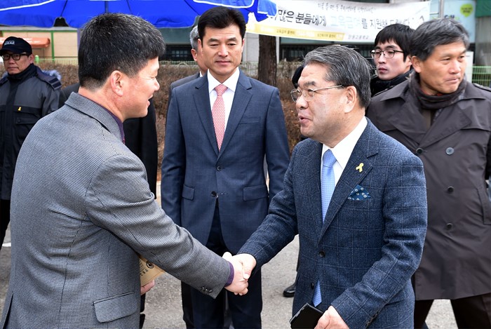 (서울=포커스뉴스) 교육 현장방문을 한 이재정(오른쪽 두번째) 경기도교육감이 2일 오전 경기도 안산시 단원고등학교에서 교직원들과 인사를 나누고 있다. <사진제공=경기도교육청>