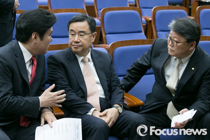 (서울=포커스뉴스) 새누리당 원유철(왼쪽부터) 원내대표와 김정훈 정책위의장, 조원진 원내수석부대표가 2일 오전 서울 여의도 국회에서 열린 의원총회에 참석해 대화하고 있다.