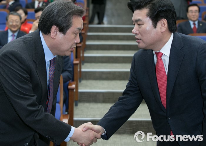 (서울=포커스뉴스) 김무성(왼쪽) 새누리당 대표와 원유철 원내대표가 2일 오전 서울 여의도 국회에서 열린 의원총회에 참석해 악수하고 있다.