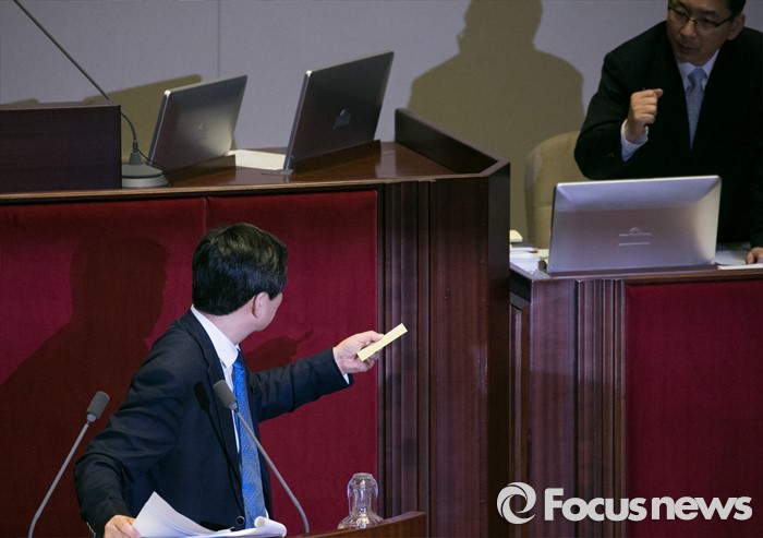 (서울=포커스뉴스) 테러방지법 직권상정에 반발해 야당이 세계 최장 기록의 필리버스터(무제한 토론)를 이어가고 있는 2일 오전 서울 여의도 국회 본회의장에서 토론에 참여한 이종걸 더불어민주당 원내대표가 발언 중 국회 관계자로부터 전달받은 메모를 보고 있다. 야당은 이날 필리버스터를 중단하고 선거법 등을 처리할 예정이다.