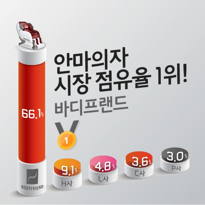 조사 결과를 살펴보면, 지난해 바디프랜드의 국내 안마의자 시장점유율은 66.1%이었다. 이는 전년(51.4%) 대비 14.7%p 증가한 수치다.
