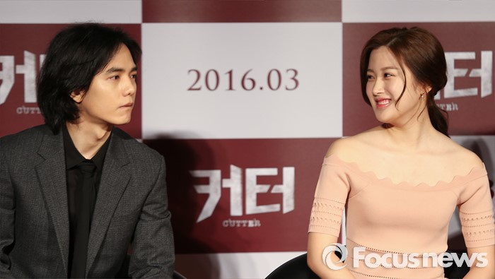 (서울=포커스뉴스) 2일 오전 서울 광진구 롯데시네마 건대입구점에서 열린 영화 '커터'(감독 정희성) 제작보고회에 참석한 배우 김시후(왼쪽)와 문가영이 취재진에게 질문을 받고 있다.